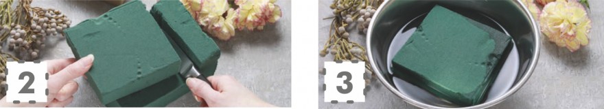 Gąbkę florystyczną docinamy na wymiar wnętrza naszej skrzynki, w której przygotujemy ikebanę. Ważne, żeby gąbka nie wystawała ponad brzegi skrzynki i nie była widoczna – najlepiej, żeby kończyła się na 3/4 wysokości.