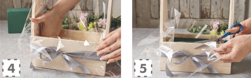 Do naczynia nalewamy zimną wodę i wkładamy do nasączenia gąbkę florystyczną. W tym czasie przygotowujemy skrzynkę, dekorując jej obwód wstążką i wyściełając folią.