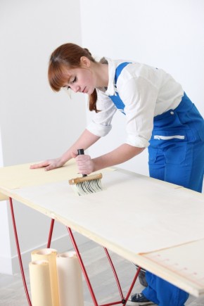 Cięcie tapety i jej smarowanie klejem najwygodniej wykonywać na specjalnym stole do tapetowania. Powinien mieć stabilną np. stalową konstrukcję oraz wykonany z trwałego materiału, wygodny blat o szerokości nieco przekraczającej szerokość tapet (np. 60 cm). Blat powinien być bardzo długi – 200-300 cm, co sprawia, że możemy nałożyć klej na tapetę bez ryzyka jej pofałdowania. Jego optymalna wysokość to 80 cm. Ułatwieniem jest praktyczna podziałka przydatna podczas przycinania tapety. Wybierzmy lekki model, który łatwo się składa i rozkłada, a po złożeniu ma niewielkie wymiary. Potrzebne nam będą również nożyce do tapet, które wykorzystamy do przycinania rozwiniętych brytów tapety. Kolejne niezbędne narzędzie do tapetowania to szeroki pędzel ławkowiec z włókna syntetycznego, do nanoszenia kleju na tapetę. Pędzel tapetowy ma dużą powierzchnię roboczą – jego długie i szerokie włosie (np. 3 x 10-12 cm) usprawnia i przyspiesza prace. Wygodzie prac sprzyja plastikowy haczyk na trzonku, który sprawia, że pędzel można zawiesić na rancie wiaderka i nie wpadnie do kleju. Klej będzie nam najwygodniej nanosić z plastikowego wiaderka.
